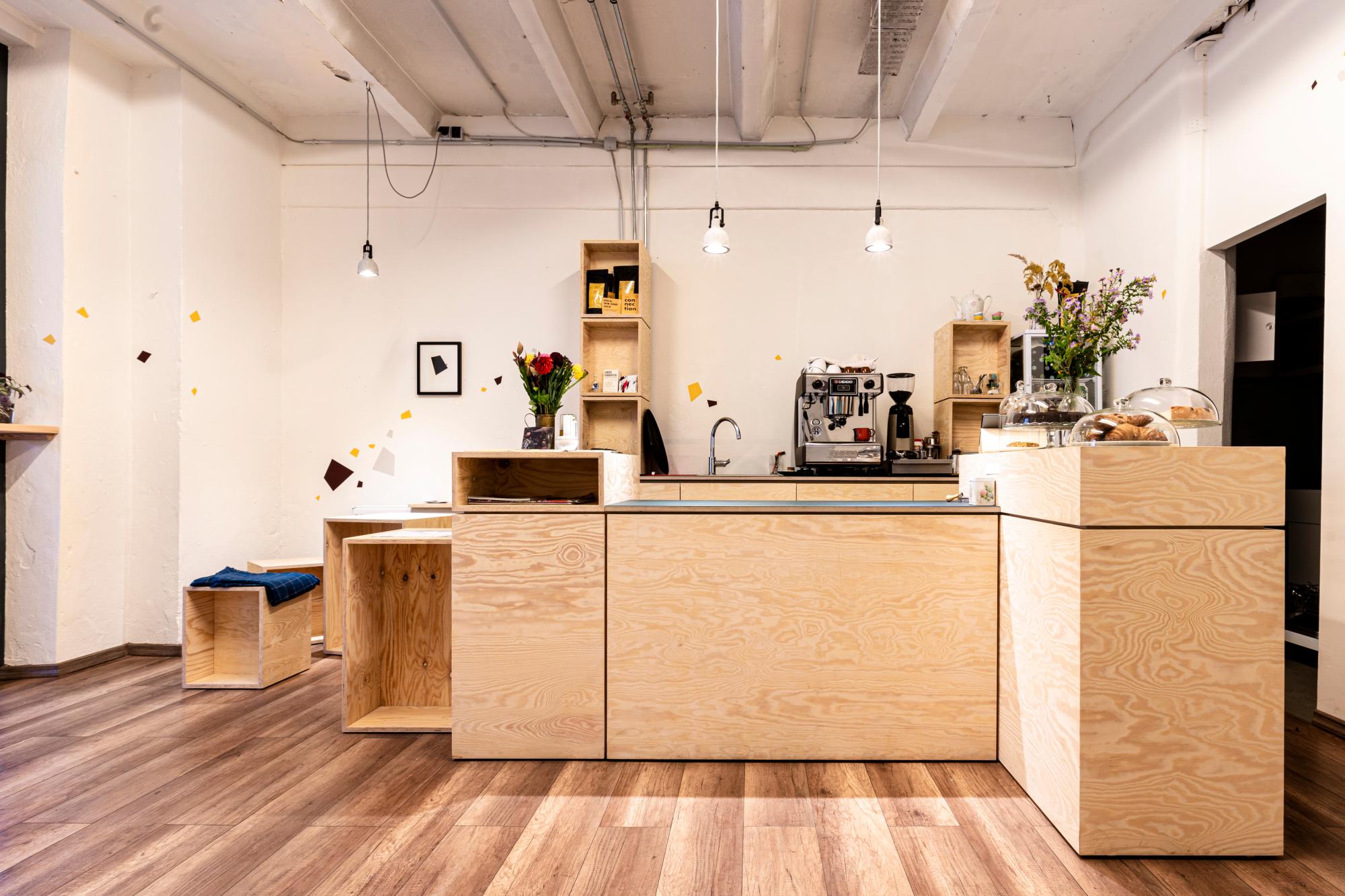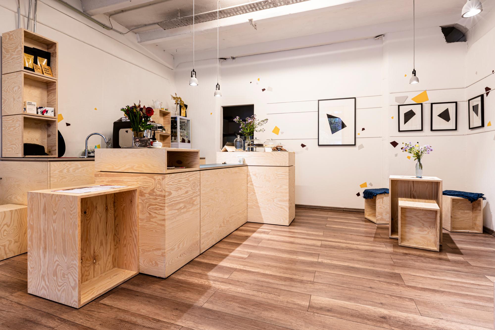 Neben der Thekenanlage wurden flexible Sitzmöglichkeiten geschaffen: Kleine, modulare Hocker und Tische, die sich bei Bedarf stapeln und als Regal verwenden lassen, ergänzen das Gesamtkonzept und bieten praktische Lösungen auf kleinem Raum.