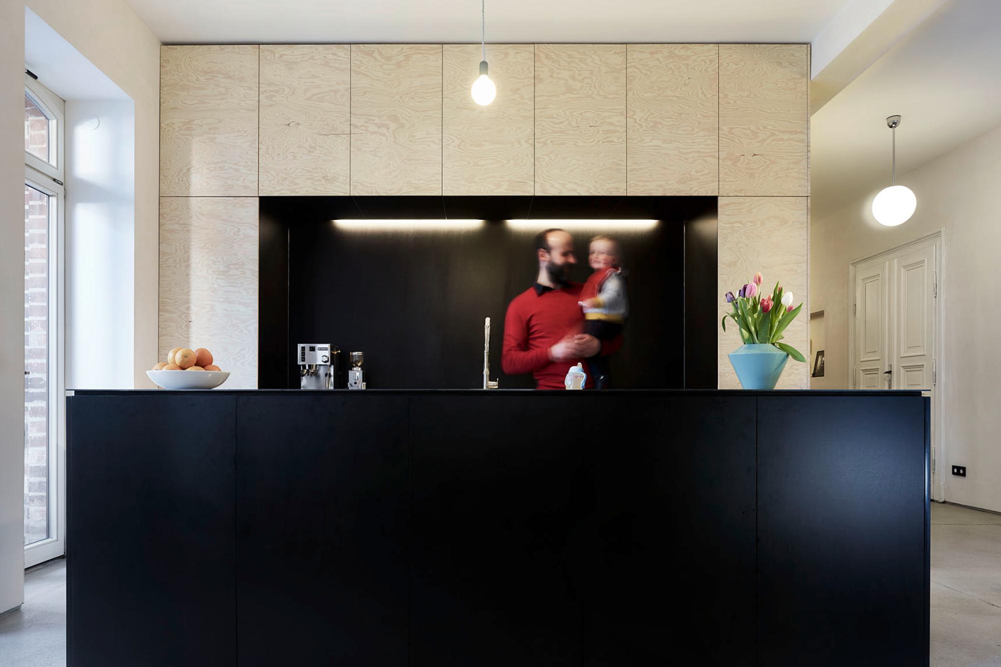 Diese stilvolle Küche kombiniert natürliche mit industriellen Materialien. Die Fronten der Küchenzeile aus hell geölter Seekiefer verleihen dem Raum eine warme, moderne Note. Im Kontrast dazu steht die großzügige Kücheninsel aus robusten schwarzen Filmplatten, die für klare Linien und eine starke Präsenz sorgt. Die gebürsteten Edelstahlplatten unterstreichen den minimalistischen Look