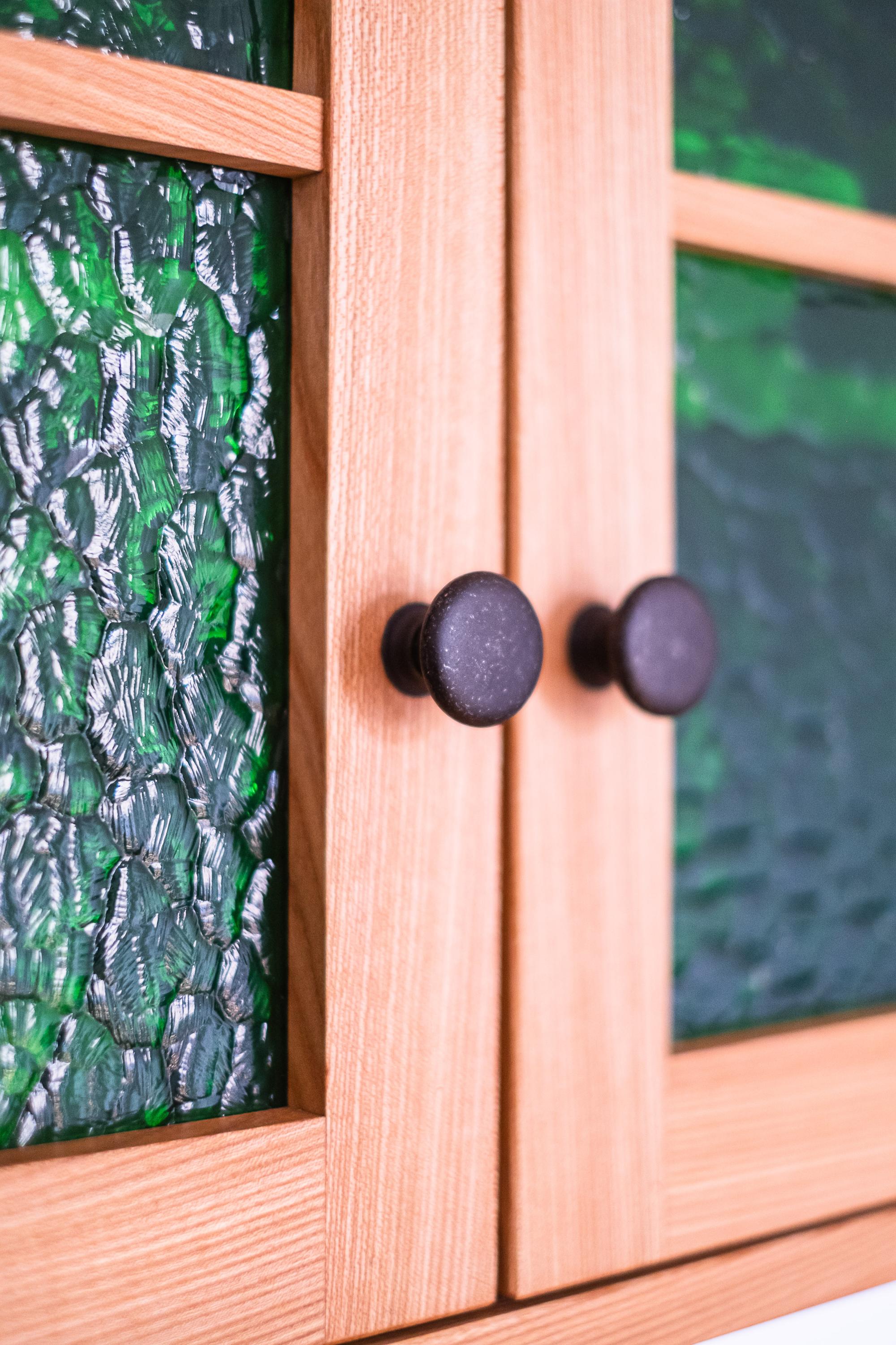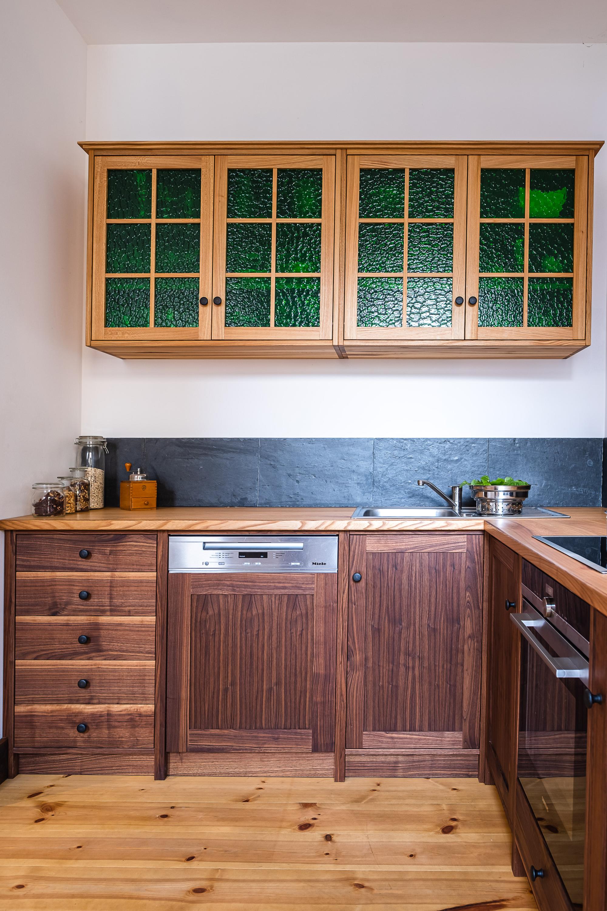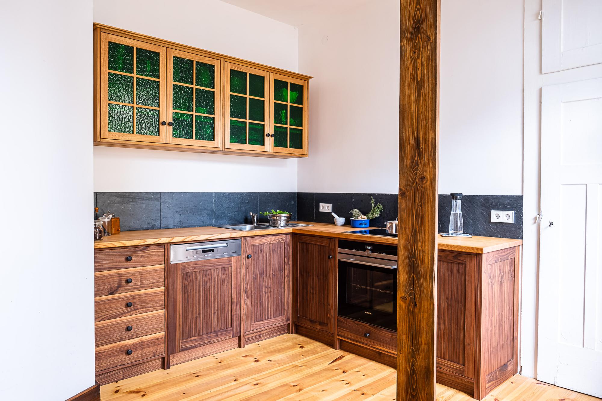 Diese eher rustikale Massivholzküche vereint ein harmonisches Zusammenspiel von dunklem Nussbaum der Möbelfronten und heller Rüster der Arbeitsplatte. Die Oberschränke aus Rüster mit grünen Glasfüllungen fügen einen touch von Jugendstil-Eleganz hinzu und passen sich perfekt den historischen Zimmertüren an. Die Kombination von warmen Holzfarben und den grünen Akzenten schafft eine einzigartige Atmosphäre, die genau den Geschmack der Kunden trifft.