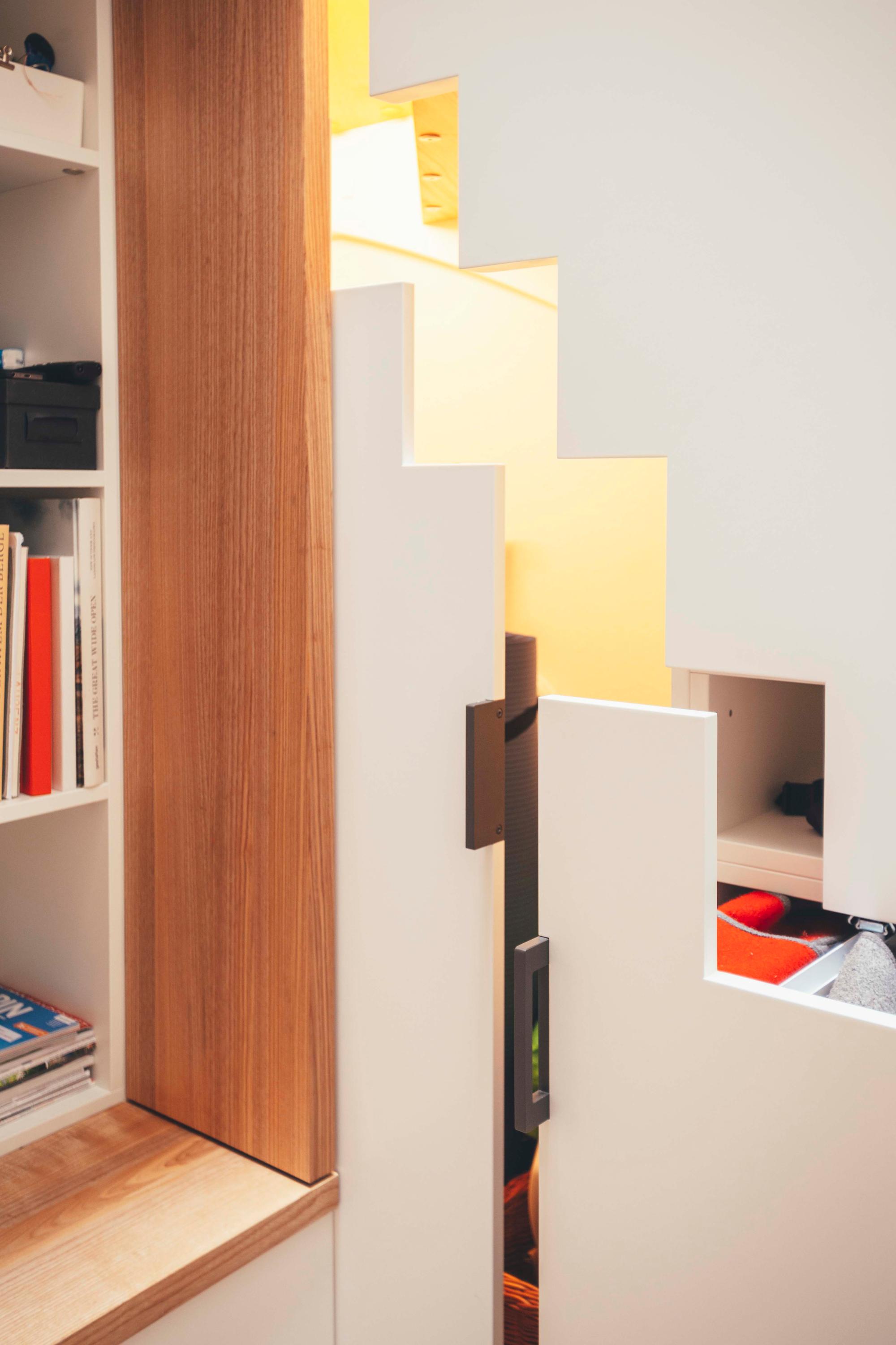 Ziel dieses Projekts war es, einen hellen, modernen Treppenraum mit viel Stauraum zu gestalten, ohne ihn erdrückend wirken zu lassen. In Zusammenarbeit mit Treppenbau Thierbach entstand eine platzsparende Dreifach-Wendeltreppe mit massiven Eschenstufen und weißen Schrankflächen. Eine integrierte Garderobe aus Esche mit Beleuchtung, eine kleine Kammer und Schubkästen im Setzstufenbereich bieten zusätzlichen Stauraum – ideal für kompakte Wohnräume.